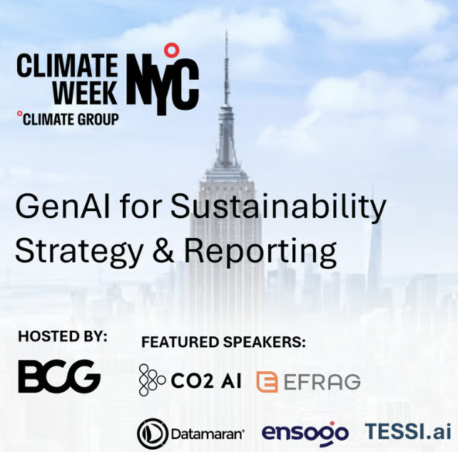 Join us to explore how GenAI is transforming sustainability strategy, reporting, and operations. Senior voices from BCG, CO2 AI, Datamaran, EFRAG, TESSI.ai, and Ensogo will discuss how AI is embedding sustainability into everyday decision-making, accelerating adoption of ESRS, streamlining reporting across CSRD, SEC, and ISSB, and turning compliance into opportunities for resilience, growth, and competitive advantage.